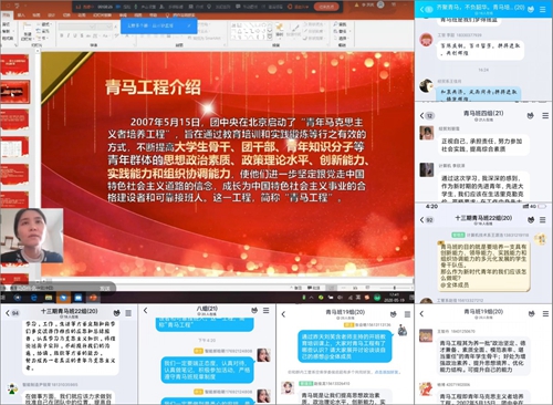 创新培训形式。本期青马班利用钉钉建立网上课堂,开设线上课程;成立临时团支部,选拔支部委员,对来自八个院系的473名学员重新混编分组,以团小组的形式开展互动互助,通过开展“云端破冰”和适合线上的课前展示环节,学员们发挥主观能动性,以微视频制作、隔屏共唱团校校歌、用才艺为祖国“战疫”打call等丰富多彩的内容和形式,打破空间隔阂,展现青春风采,营造团结奋进的学习氛围。