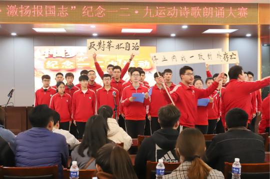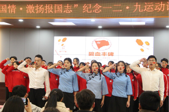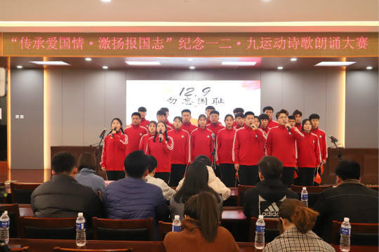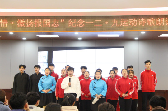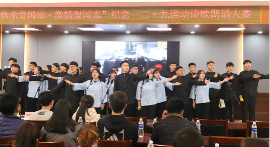 为纪念“一二·九”爱国运动84周年,将“一二·九”精神薪火相传,激励工院学子的爱国情怀,使青年学生牢记责任和使命,12月9日晚,我院在五楼报告厅举办了以“传承爱国情·激扬报国志”为主题的诗歌朗诵比赛,本次比赛由院团委李桉冰老师、智能制造学院邱京老师、工商管理系董力强老师担任评委。