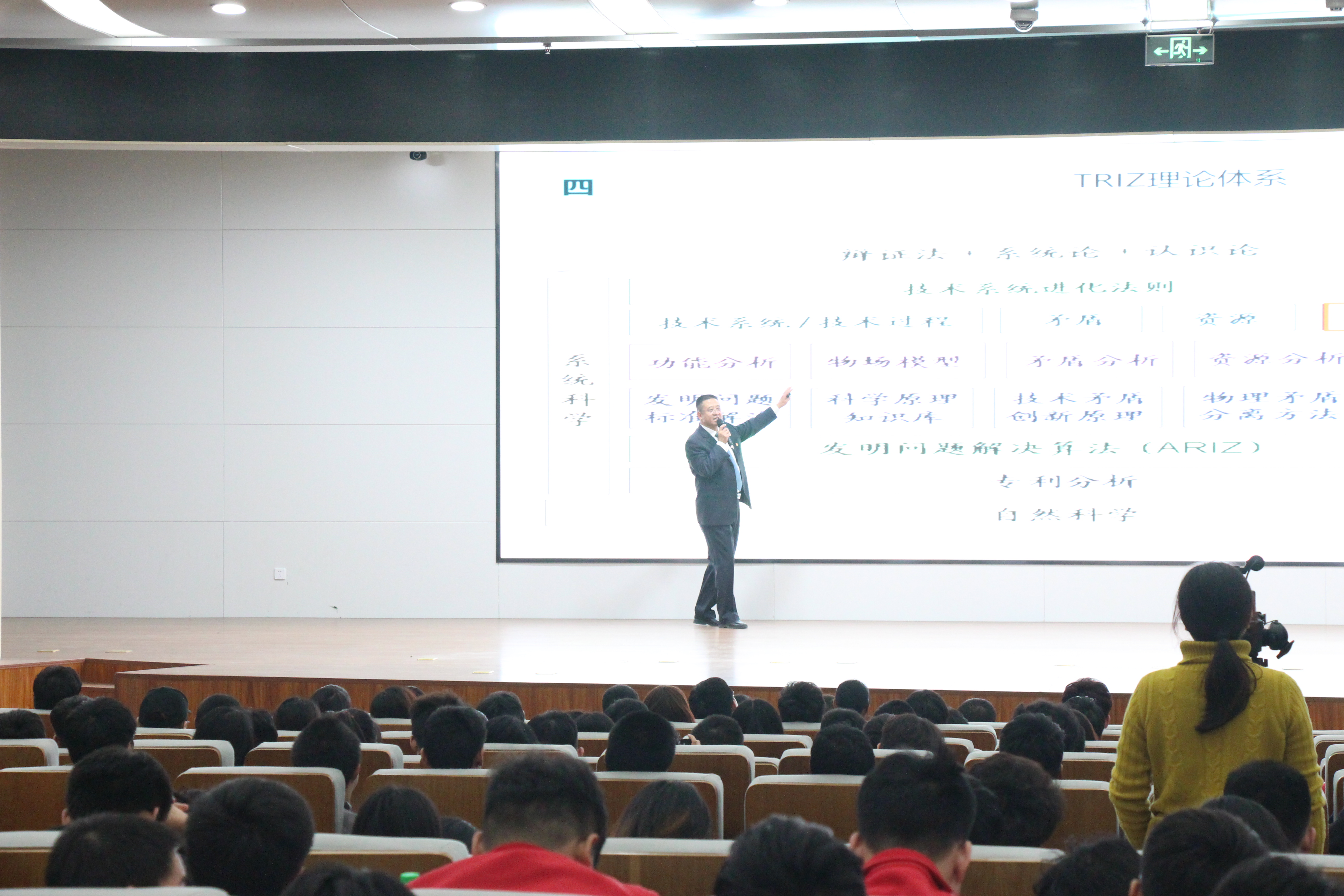 韩提文教授以几个生动有趣又具有创新性的小视频引导大家了解创造力,提示同学们要用创意来解决生活中各种问题。之后为学生们讲述了什么是创造力,人人都有创造力,而且创造力就在我们身边,因此需要大家大开脑洞,把奇思妙想变为现实。他以创新是个人成功的源泉,是一个民族进步的灵魂,是一个国家兴旺发达的不竭动力来勉励同学们不断开拓思想勇于突破。他还从思维的源头为大家讲授创造力在所有的活动中都可以进行培养,这同时需要用专门的工具进行训练,那就是—TRIZ理论。只要掌握了TRIZ这个发明原理的点金石,大家一定会从发明创造中找到兴趣、得到奖励、并能获得成就感。他同时还鼓励学生们要创新,就要敢于突破。韩教授最后语重心长的寄语青年学生们:创新是我们时代进步的动力,也是我们个人发展的基石,我们绝不能墨守成规,要敢于创造,才能够成为时代的"弄潮儿"。学校就为大家提供了这样一个坚实有力的平台,帮助同学们成为“发明家”,开展奇思妙想进行发明创造。