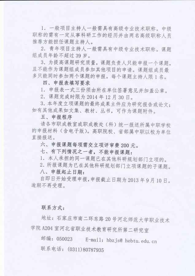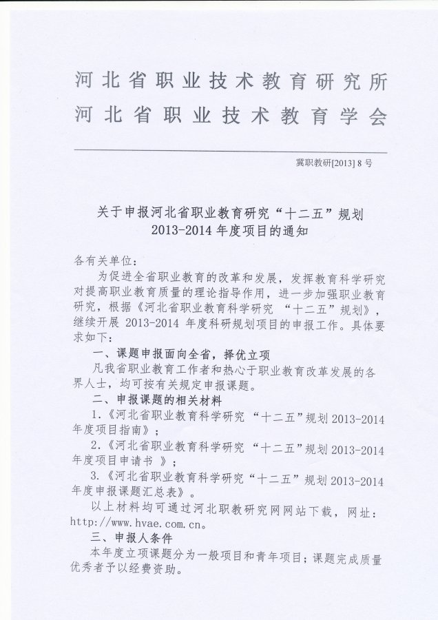 《河北省职业教育研究“十二五”规划2013-2014年度项目申报通知》近日已由河北省职业技术教育研究所下发,具体要求详见通知原文(下图,共3张)。