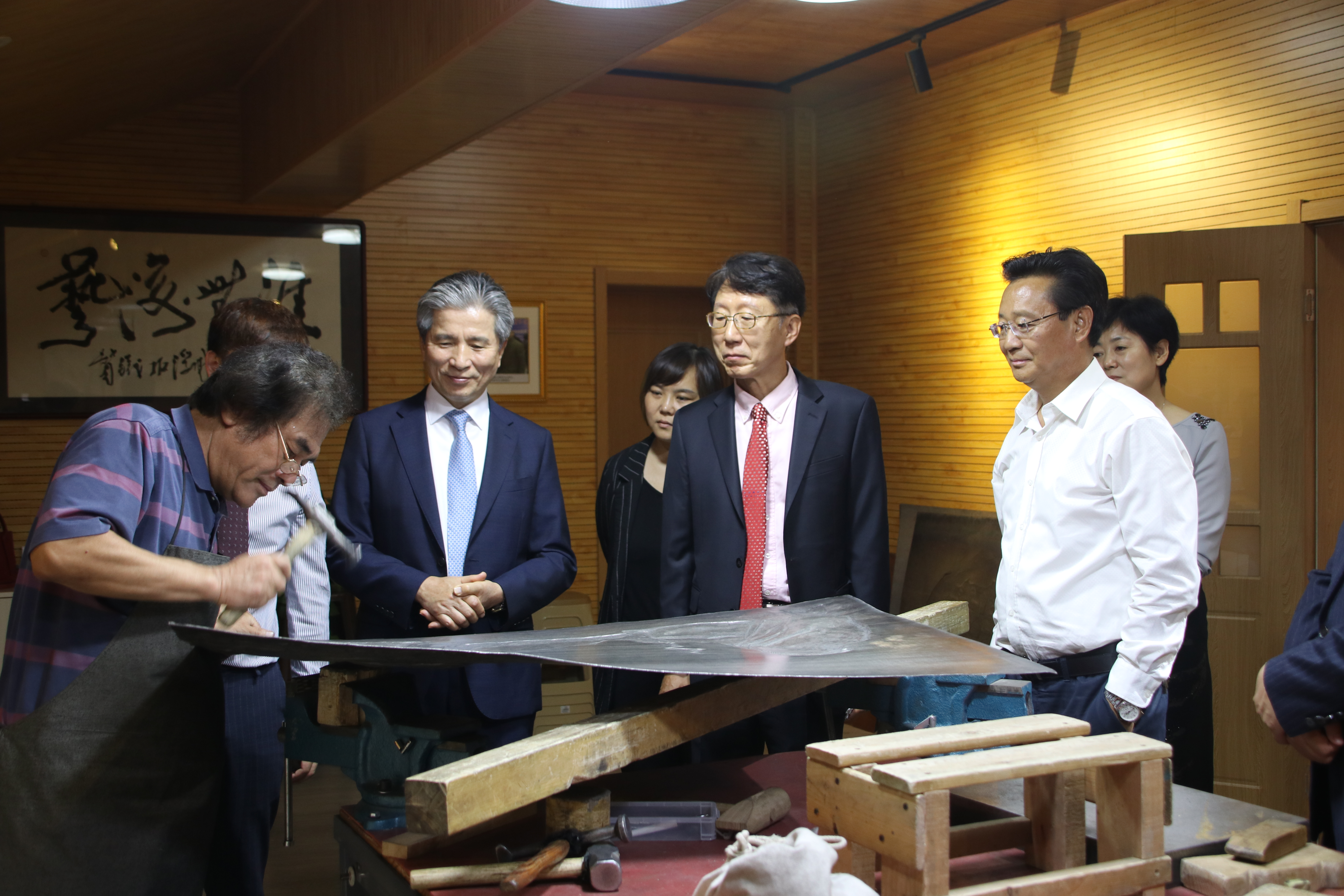 贾俊礼院长陪同客人参观了图书馆、校史馆、铁板浮雕艺术工作室。韩国客人对我院图书馆和校史馆的现代化、信息化水平表示赞赏,对铁板浮雕非遗艺术的文化魅力赞叹不已。
