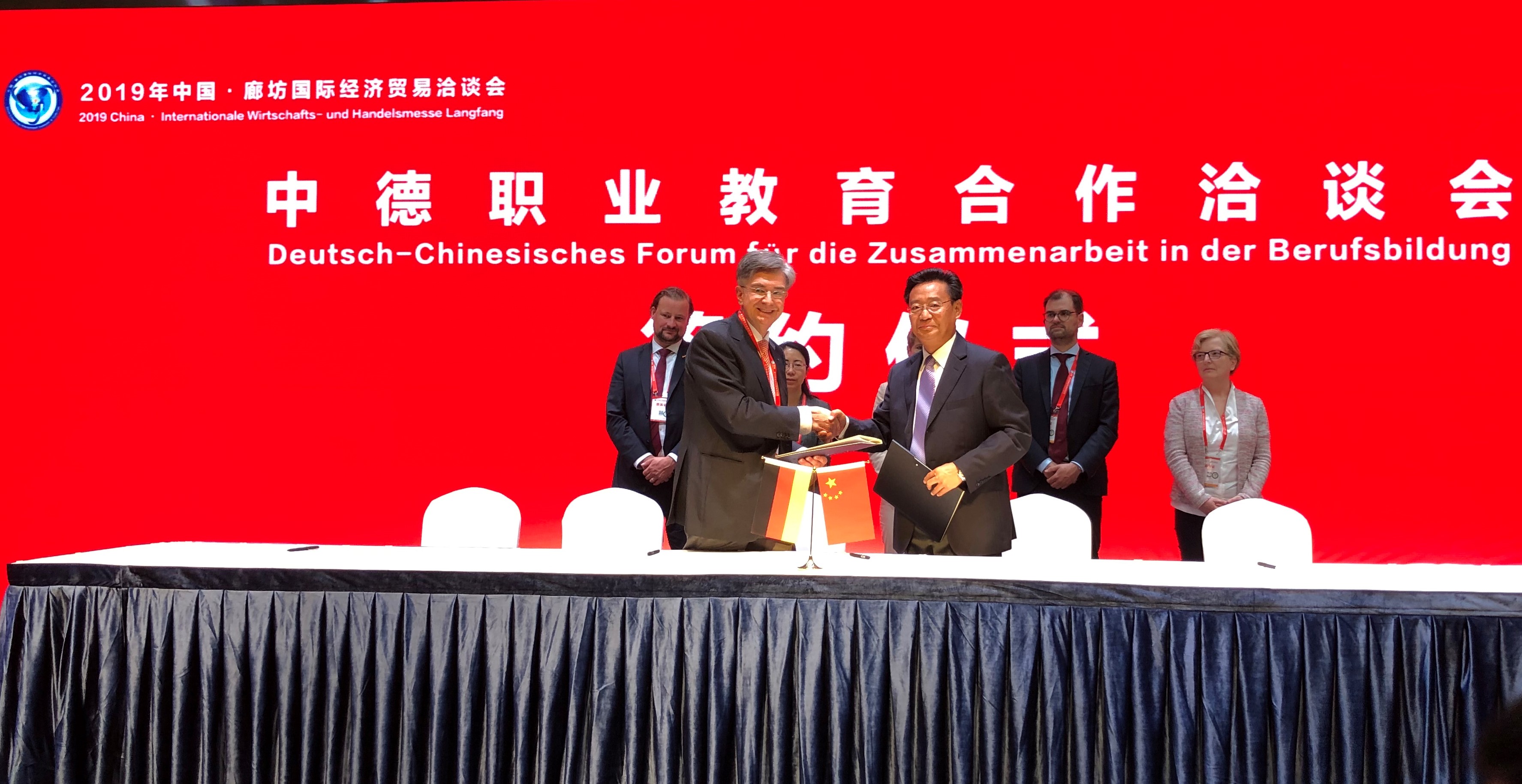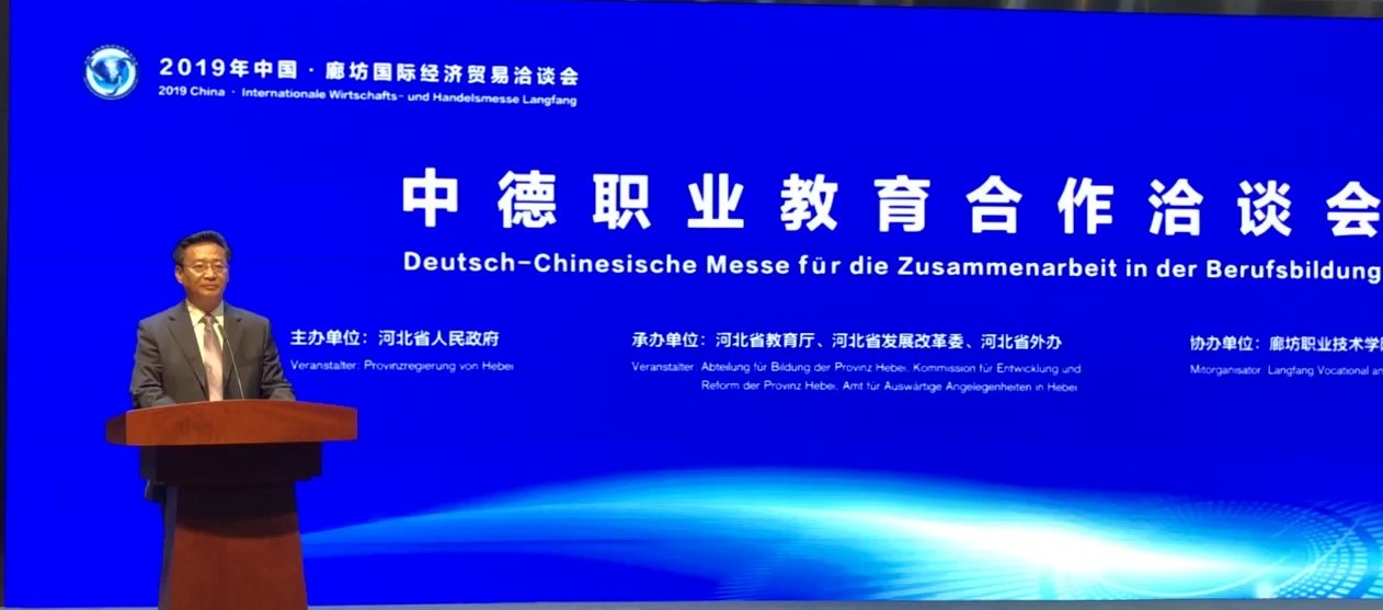 5月18日,由河北省人民政府主办,河北省教育厅、河北省发展和改革委员会和河北省人民政府外事办公室承办的“2019年中德职业教育合作洽谈会”在廊坊如期举行,来自德国相关机构的40多名代表和我省及国内其他院校参会人员共计200多人参加会议。我院院长贾俊礼、常务副院长付俊薇、国际教育交流中心负责人参加了此次会议。