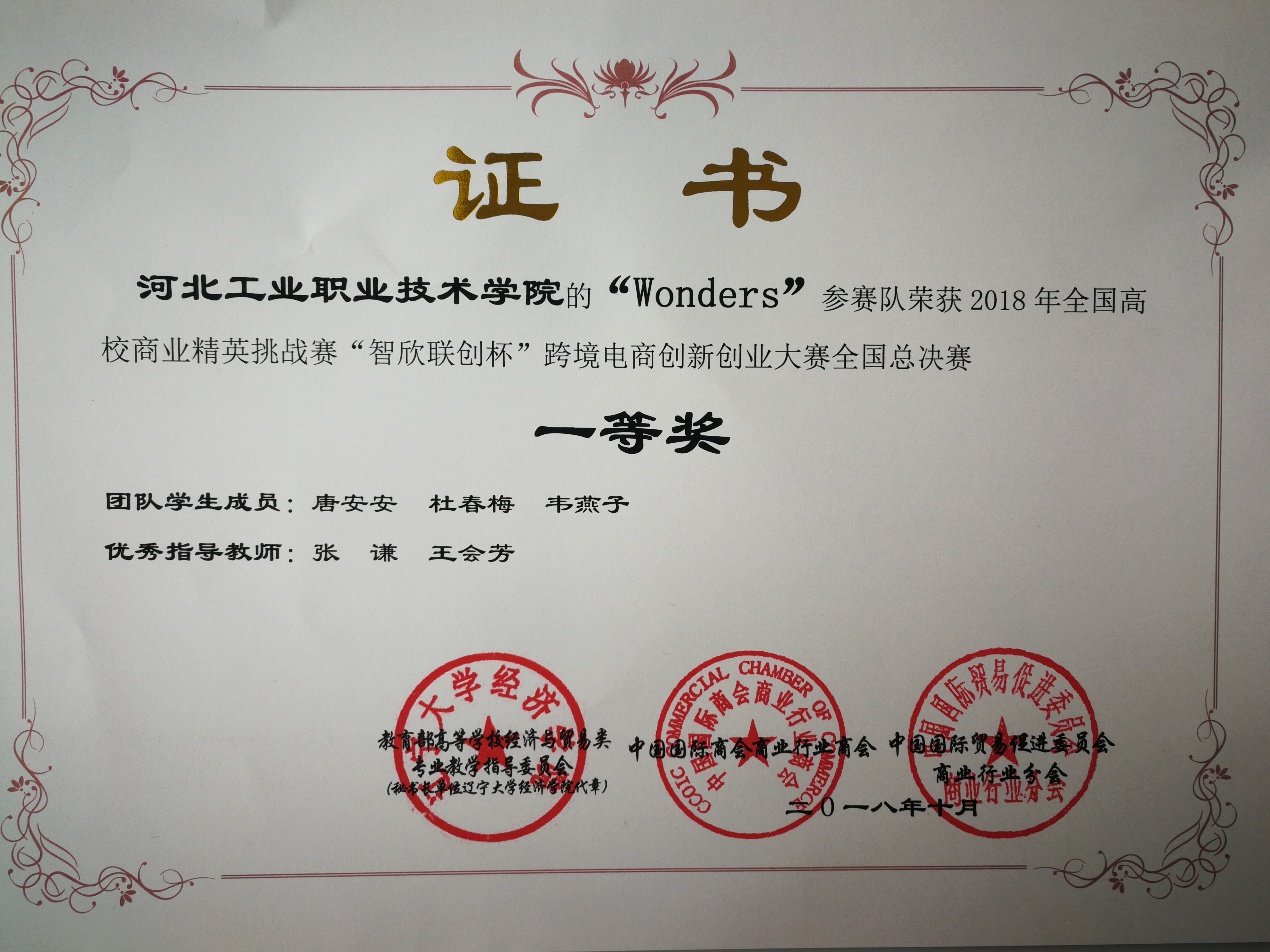 由教育部高等学校经贸类专业教学指导委员会与中国国际贸易促进委员会行业分会联合举办的全国高校商业精英挑战赛“智欣联创杯”跨境电商创新创业大赛全国总决赛落下帷幕,我院派出由经济贸易系张谦、王会芳两位老师指导的2017级唐安安、杜春梅、韦燕子组成的Wonders战队,与来自全国本专科院校的160支代表队进行激烈角逐,最终喜获一等奖。