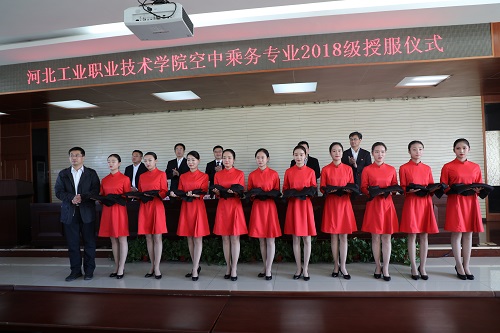 为进一步深化校企合作、提升空中乘务专业人才培养质量、拓展学生就业空间、提升我院学生对职业的重视程度和对民航事业的荣誉感和爱岗敬业的精神,10月23日上午10点,河北工业职业技术学院校企合作签约仪式暨授服仪式在办公楼五楼报告厅举行。河北工业职业技术学院招生就业指导中心、教务处、工商管理系相关负责人、北京长鸿航空信息咨询有限公司总经理秦铭、北京中航宇业管理咨询有限公司总经理杜国明、环球鹰途(北京)国际企业管理有限公司经理卢海燕和河北启艺教育科技有限公司总经理梁苗出席了签约仪式和授服仪式。