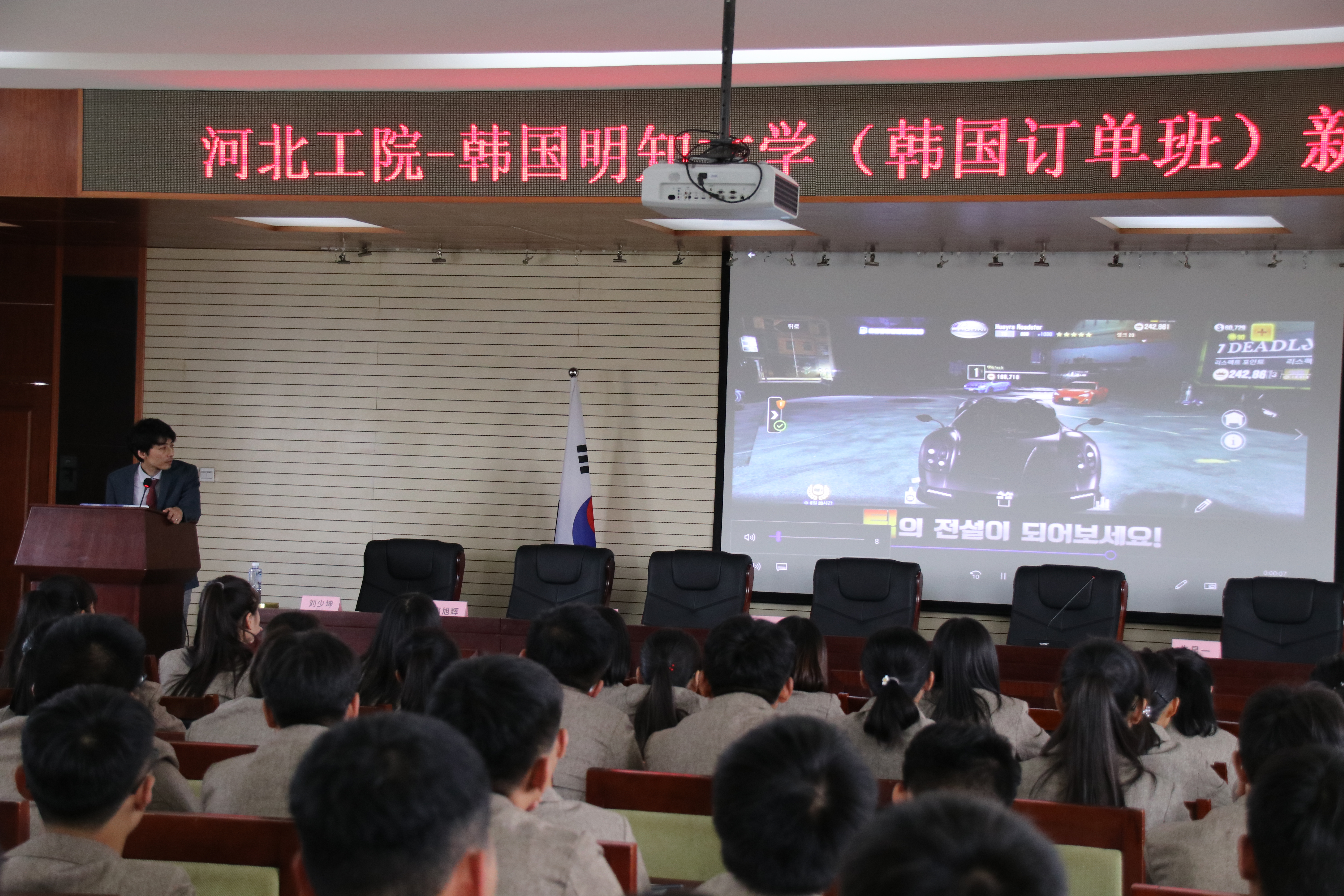 9月28日下午,我院与韩国明知大学在行政楼五楼报告厅举行2018级数字媒体应用技术(韩国订单班)新生开学典礼,学院党委书记王振杰、常务副院长付俊薇、韩国明知大学副校长朱星一、国际交流学院老师蒋田、影像设计专业教授金亨奎、韩国明知大学中国代表处河北清博通昱教育科技集团代表,以及我院计算机技术系负责人、教师代表、2018级数字媒体应用技术(韩国订单班)全体新生共同参加了仪式。