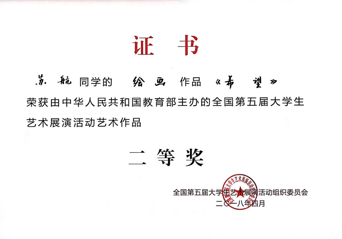 近日,由教育部、上海市人民政府主办的全国第五届大学生艺术展演活动在上海展览中心落下帷幕,来自全国400多所高校的8000多名师生齐聚一堂,将中国最新、最亮眼的高校美育特点展示在公众面前。由我院建筑工程系张朋军老师指导的苏航同学的绘画作品《希望》荣获全国二等奖。