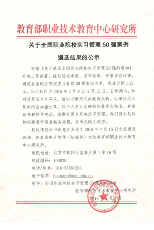 为推进职业院校管理水平提升,教育部2015年印发《职业院校管理水平提升行动计划(2015-2018)》,提出委托第三方分类遴选职业院校管理500强,实习管理50强即是其中之一。本次评选活动由教育部职业技术教育中心研究所组织,自2017年12月启动,经过院校申报、省教育厅推荐、材料评审、现场答辩、专家会议评审、网上公示等环节,历时半年之久,经过激烈角逐,最终评选出高职院校32所、中职院校18所。
