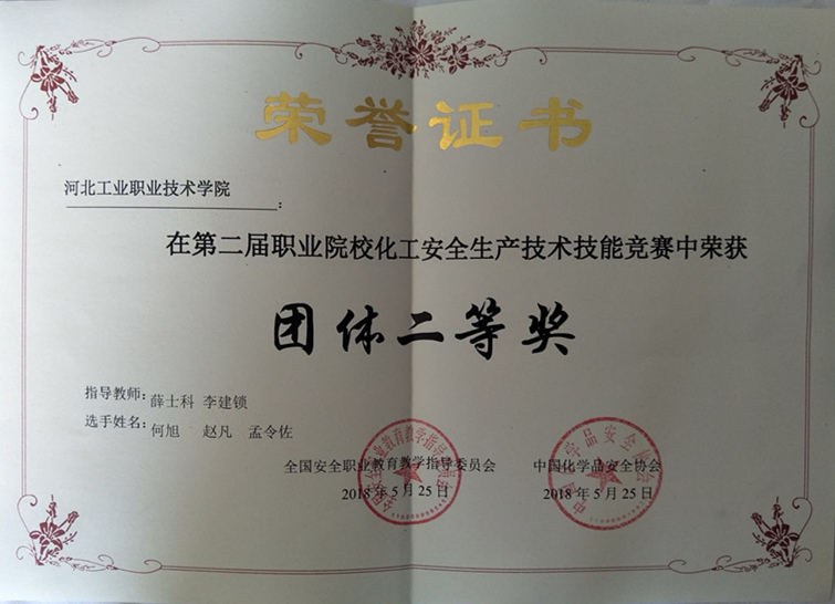 5月22日-24日,由全国安全职业教育教学指导委员会、中国化学品安全协会主办的全国职业院校化工安全生产技术技能竞赛在秦皇岛博赫科技开发有限公司开赛。来自全国20个省、直辖市、自治区的45支队伍参加了比赛。我院派出由环境与化学工程系薛士科、李建锁老师指导的2016级应用化工技术专业学生何旭和孟令佐,经过激烈角逐最终荣获大赛团体二等奖。
