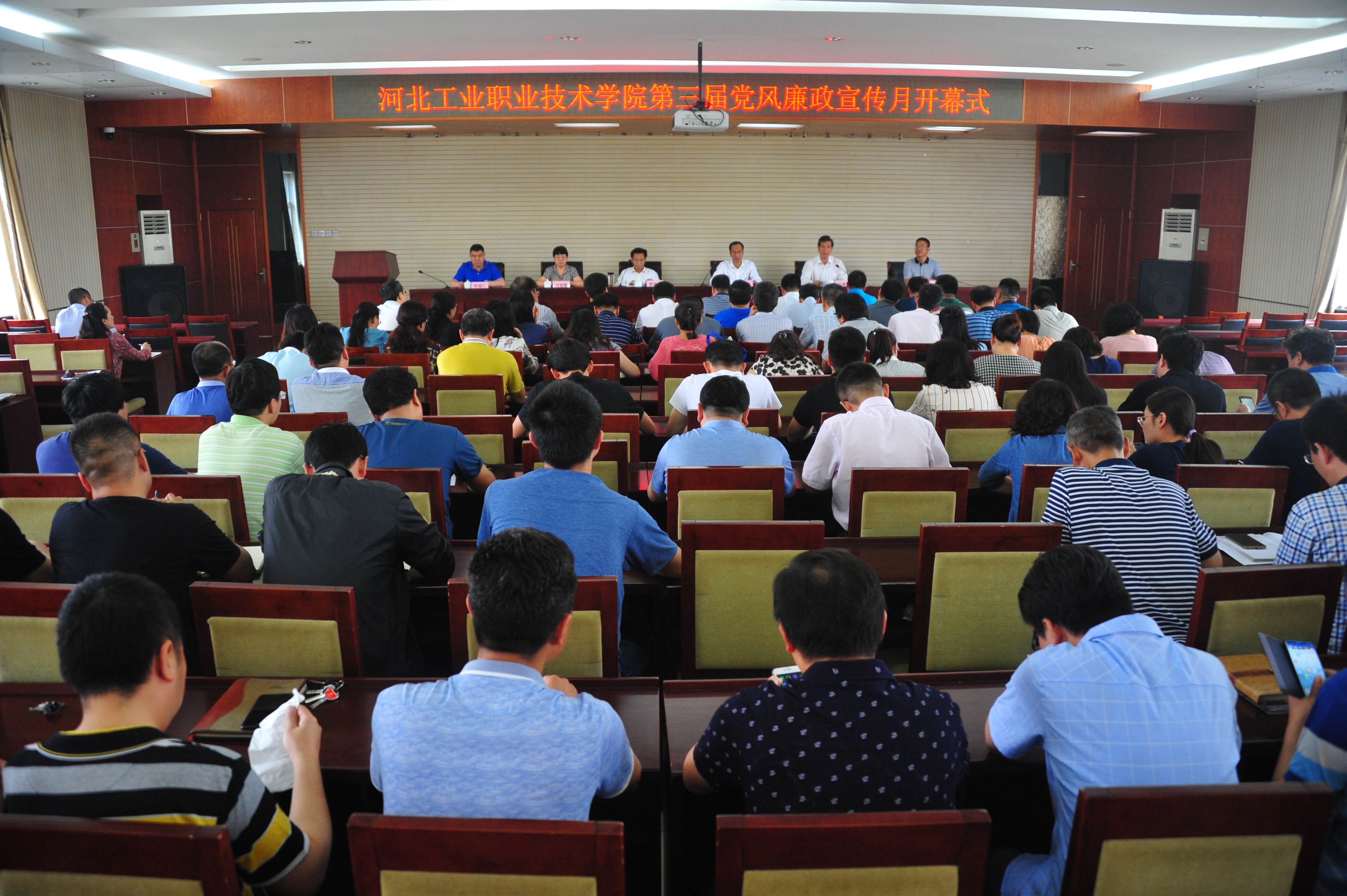 会议对学院2018年党风廉政宣传月活动进行全面动员和部署。开幕式上,院长贾俊礼宣读《河北工业职业技术学院第三届党风廉政宣传月实施方案》,明确本届党风廉政宣传月的主题是“做廉洁自律表率 促学院双高建设”,并就举办“砥砺奋进 再铸辉煌”十九大宣传展、“不忘初心 牢记使命”十九大知识竞答、“清风廉韵”廉政诗歌散文诵读及廉政专题讲座等系列宣传教育活动做出具体安排部署。