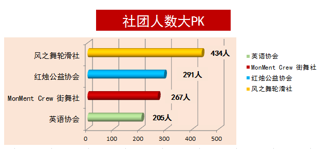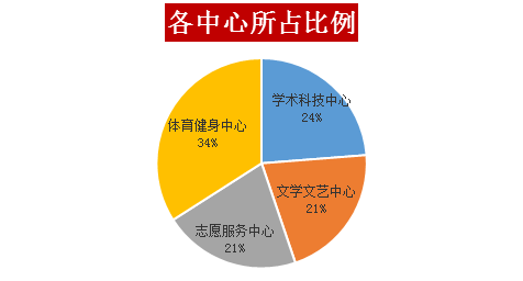 新生对学术型和体育类社团更感兴趣,在社团的四个中心中,体育健身中心的报名人数最多,有1283人加入,占纳新总数的34%;其次是学术科技中心,占纳新总数的24%。