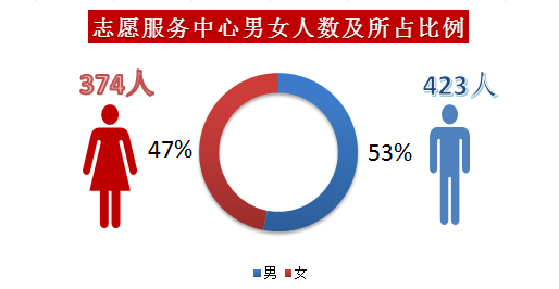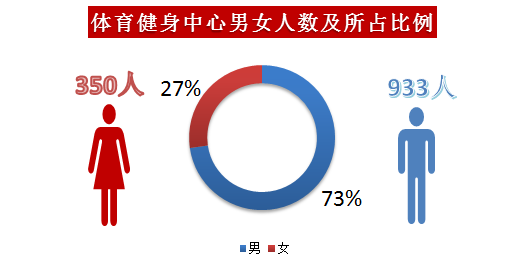 社团四个中心中,体育健身中心男女比例相差较为悬殊,有933名男生加入体育健身中心,占据比例为73%,女生比例仅为27%,说明男生对体育运动更感兴趣。