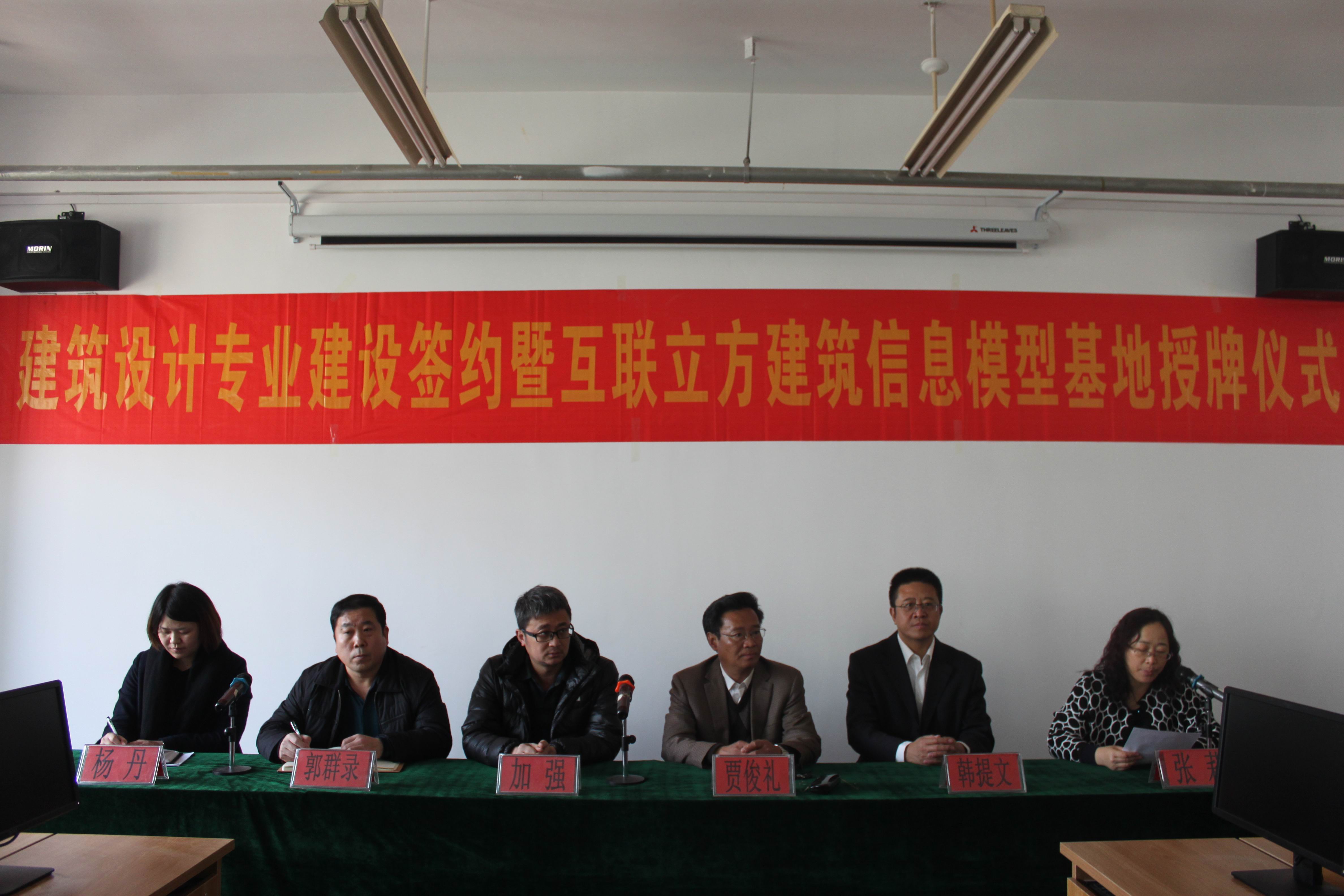 2016年3月5日上午,河北工业职业技术学院建筑设计专业建设签约暨互联立方建筑信息模型基地授牌仪式在我院隆重举行。学院贾俊礼院长、韩提文副院长、北京互联立方技术服务有限公司教育事业部北京谷雨时代教育科技有限公司营运总监加强、河北建工集团副总工郭群录、建工系、应用技术研发中心及合作企业相关人员参加了仪式。