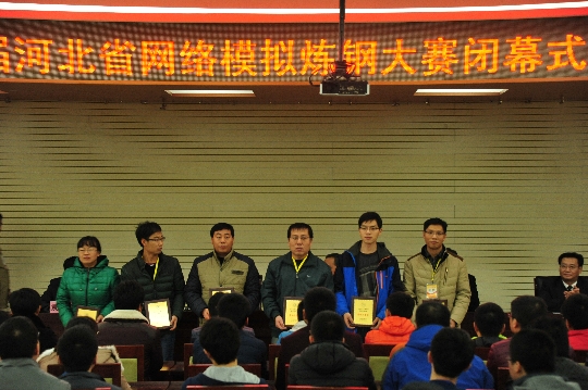 下午,大赛闭幕仪式暨颁奖典礼在我院五楼报告厅隆重举行。河北省冶金学会理事长刘如军、河北省机械冶金建材工会主任胡承江、河北省冶金学会副理事长、秘书长陈冬、河北省冶金学会副秘书长张敬民及我院贾俊礼院长出席了闭幕式。会上,胡承江主任宣布比赛成绩,贾俊礼院长和陈冬秘书长分别发表讲话。