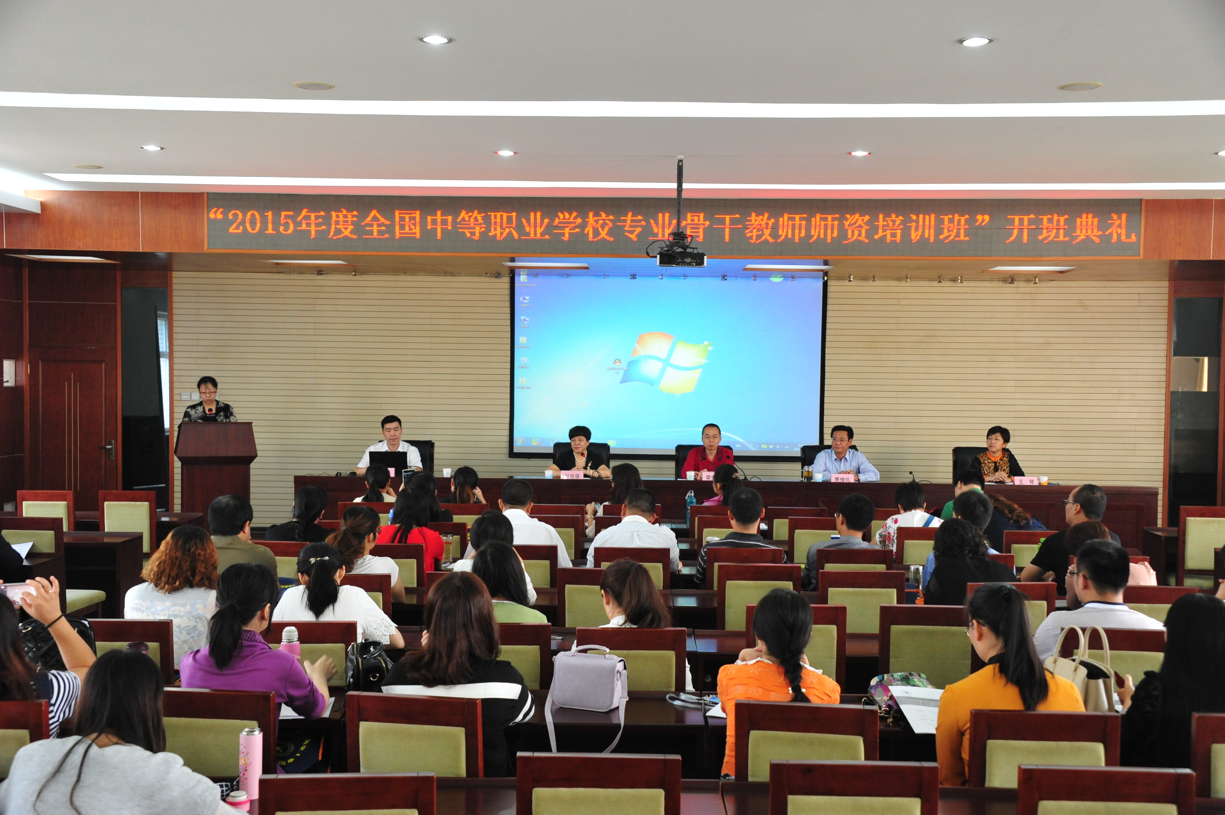 2015年 9月14日上午,2015年度电子商务专业和市场营销专业中职骨干教师国家级培训班开班典礼在学院报告厅隆重举行。河北省教育厅职成教处梁贵平主任、学院贾俊礼院长、付俊薇副院长出席开班典礼,成人教育部、经济贸易系负责人及国培基地相关工作人员、培训班授课教师代表和来自全国13个省市的40余名中职学校电子商务和市场营销专业骨干教师参加了开班典礼。开班典礼由付俊薇副院长主持。