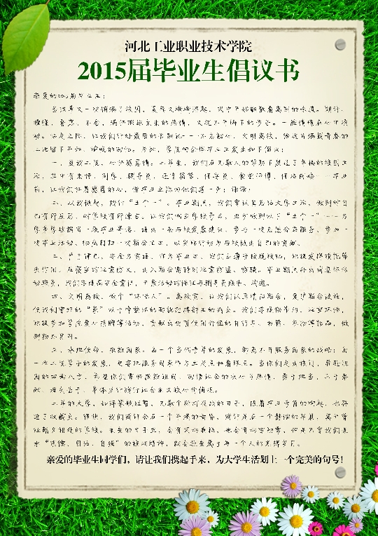 长风破浪会有时,直挂云帆济沧海。毕业生文明离校是大学生精神风貌的集中展现,是对学院育人成果和管理水平的集中检验,直接关系到学院的安全稳定、社会声誉和学生切身利益。在全院上下的共同努力下,河北工院2015届毕业生们满载着几年的收获和对母校老师、同学的依依不舍之情,已用文明、互助、有序的方式轻轻踏上了远行的旅程。愿他们秉承母校优良传统,搏击出精彩人生,努力实现自己的人生价值,书写更加华美的人生篇章!