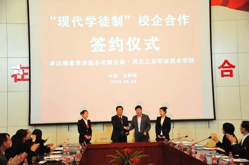 2015年4月9日,我院与河北卓达颐家养老服务有限公司就推动京津冀地区养老事业发展与人才培养、校企深度融合的战略协同发展问题,签署现代学徒制战略合作协议。学院院长贾俊礼出席签约仪式。签约仪式由河北省家政行业协会马金永书记主持。河北省家政行业协会会长霍观宇、河北省商务厅商贸服务处金成处长以及行业企业领导共80余人莅临了签约仪式。