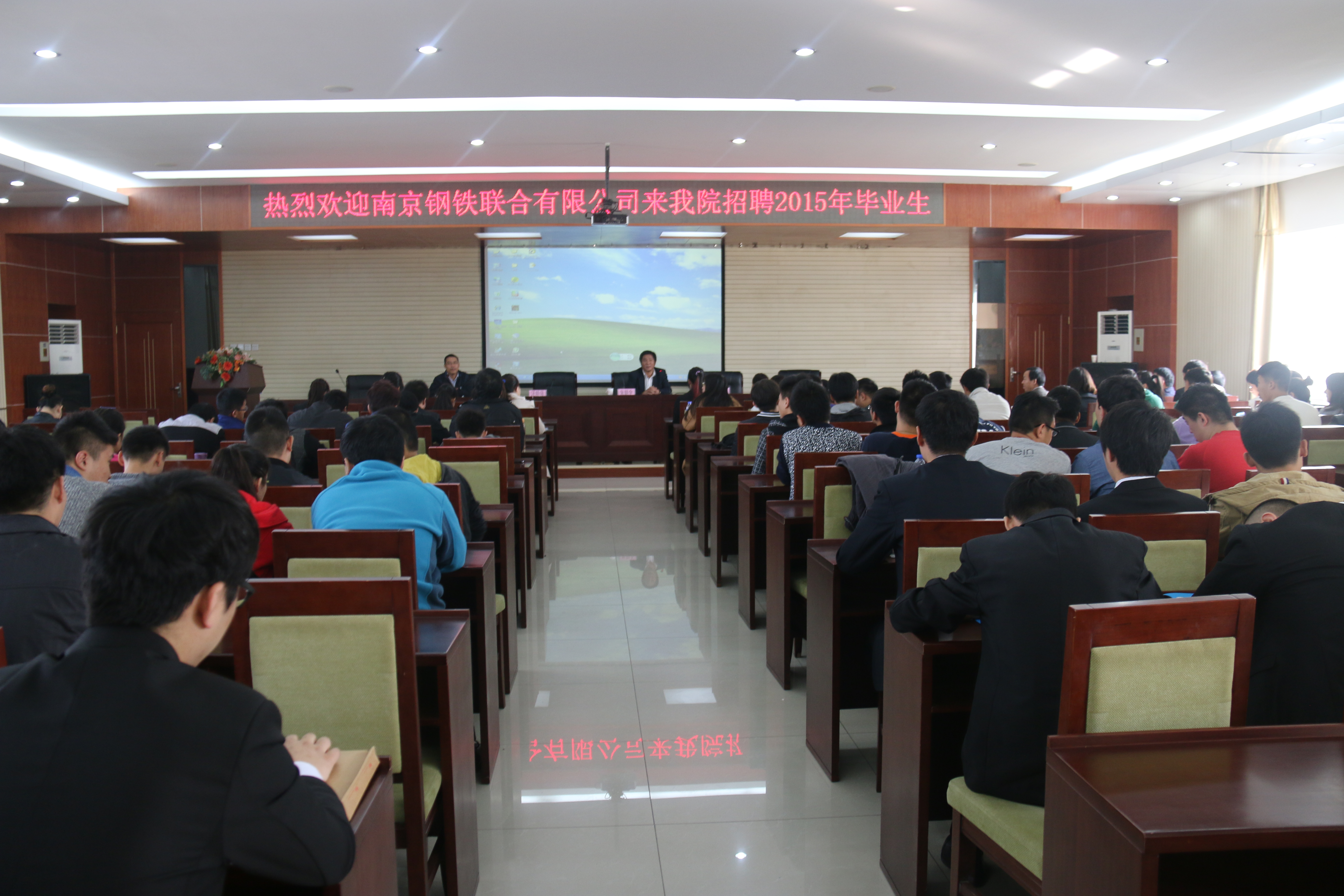 10月27日,南京钢铁联合有限公司朱朝全主任一行四人,日照钢铁有限公司李凯副部长一行2人来我院招聘毕业生,经过宣讲、投递简历、面试、签约等环节,最终南京钢铁联合有限公司录取24人(包括本科2人),日照钢铁有限公司录取9人。现场签订了就业协议书,预计本学期将到企业顶岗实习。