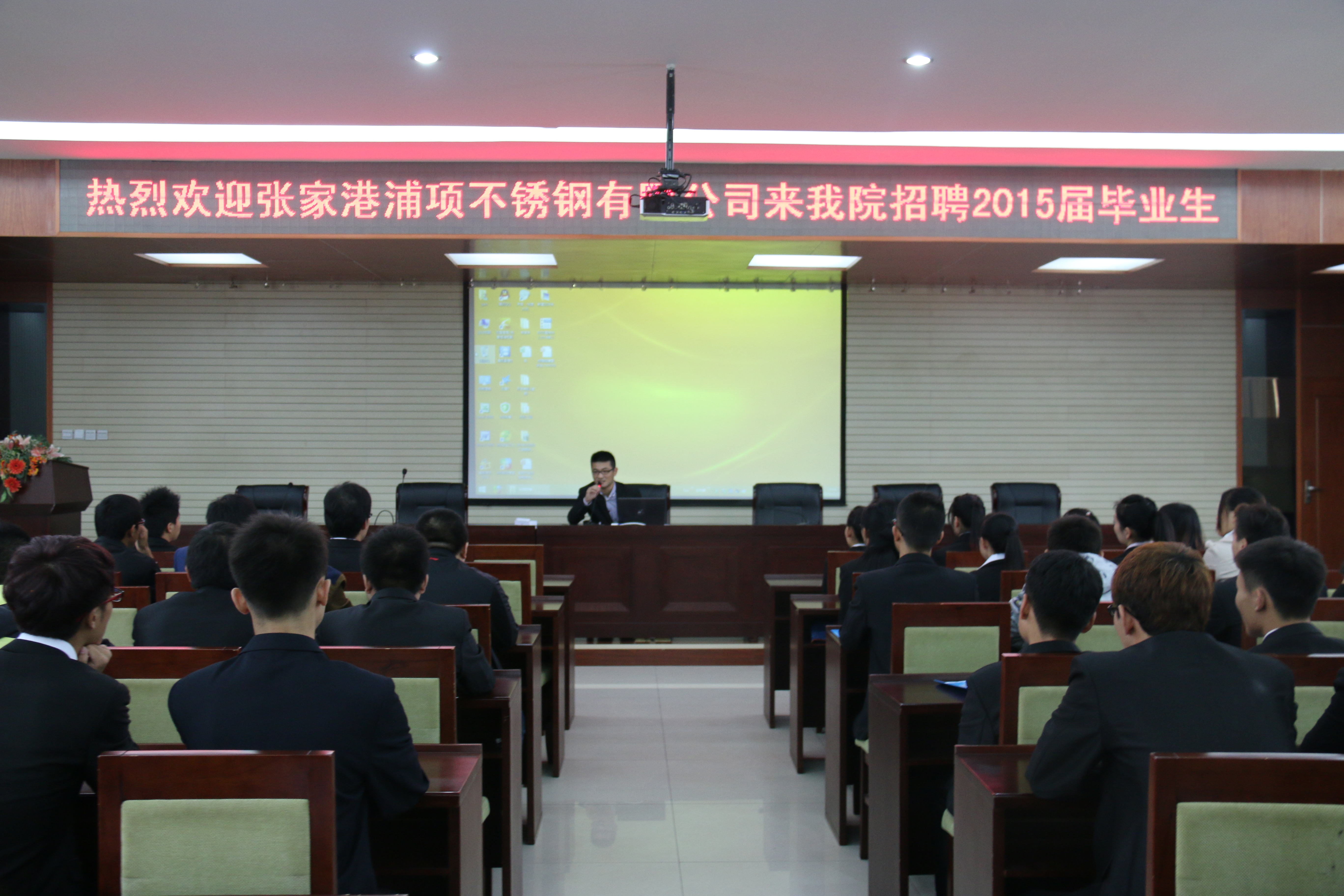 10月22日,张家港浦项不锈钢有限公司人力资源部河在澈部长一行4人来我院招聘2015届毕业生。经过宣讲、面试、最终录用9名2015届毕业生。