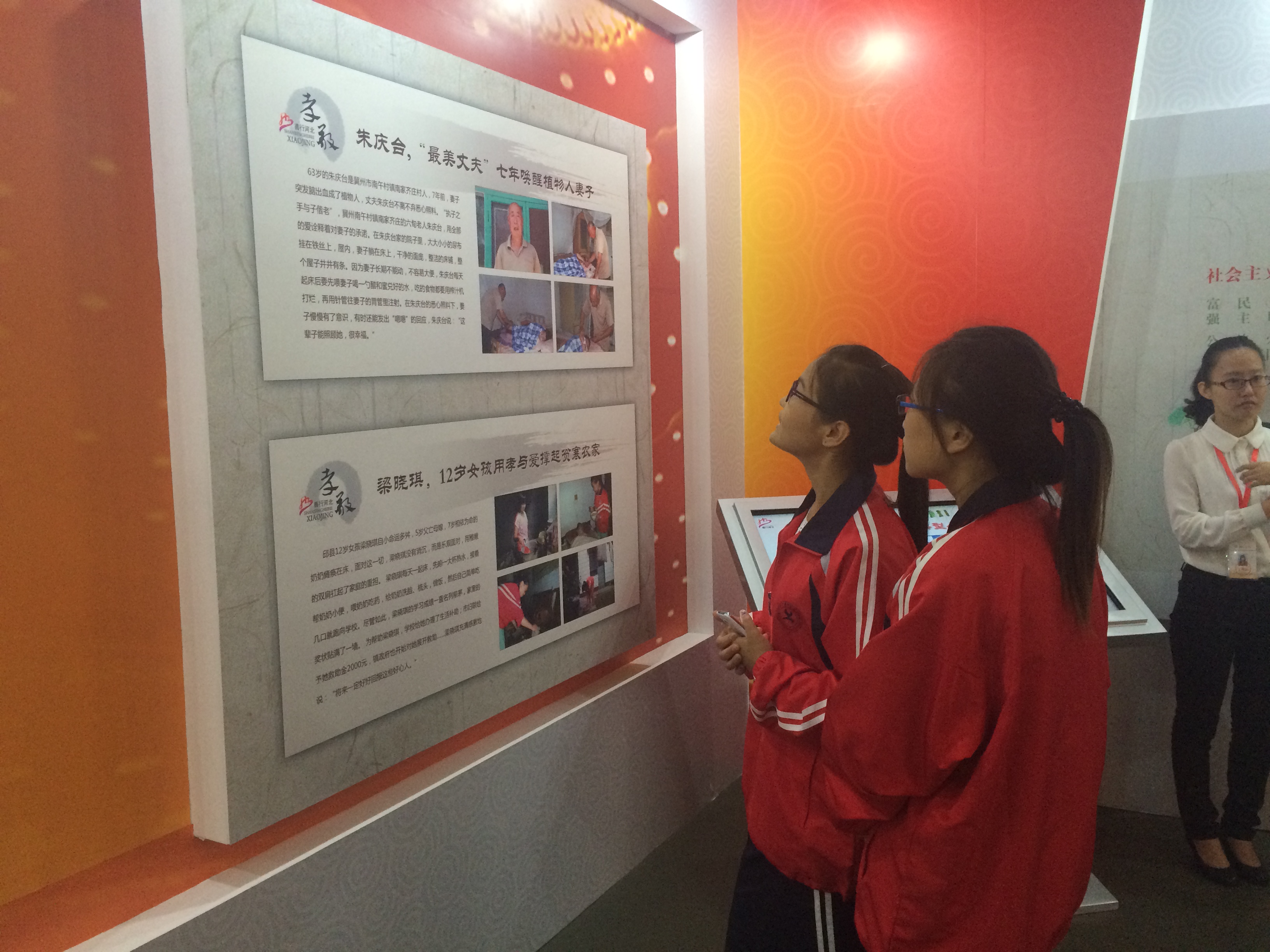 本次展览以图片、文字、视频、触屏等形式,分互助、诚信、敬业、勤俭、孝敬五个版块,图文并茂地展示了“善行河北”活动中265位代表人物的感人事迹。他们在不同的工作岗位和人生经历中因为对真善美的选择和坚持,演绎了各自的精彩人生和“最美”故事,为全社会树立了道德标杆,传递了正能量。