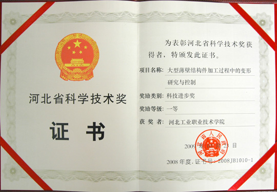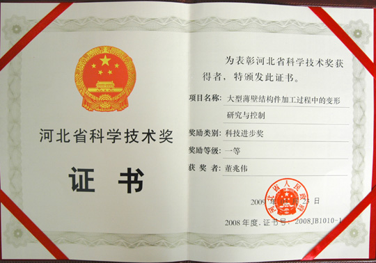日前,我院董兆伟教授主持的“大型薄壁结构件加工过程中的变形研究与控制”项目被河北省人民政府评为河北省2008年度科学技术一等奖。