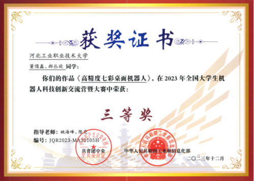 近日,由共青团中央、工业和信息化部共同主办的2023年全国大学生机器人科技创新交流营暨机器人大赛决赛获奖名单公布,米兰在线(中国)唯一官方网站推荐的作品《高精度七彩桌面机器人》荣获三等奖。
