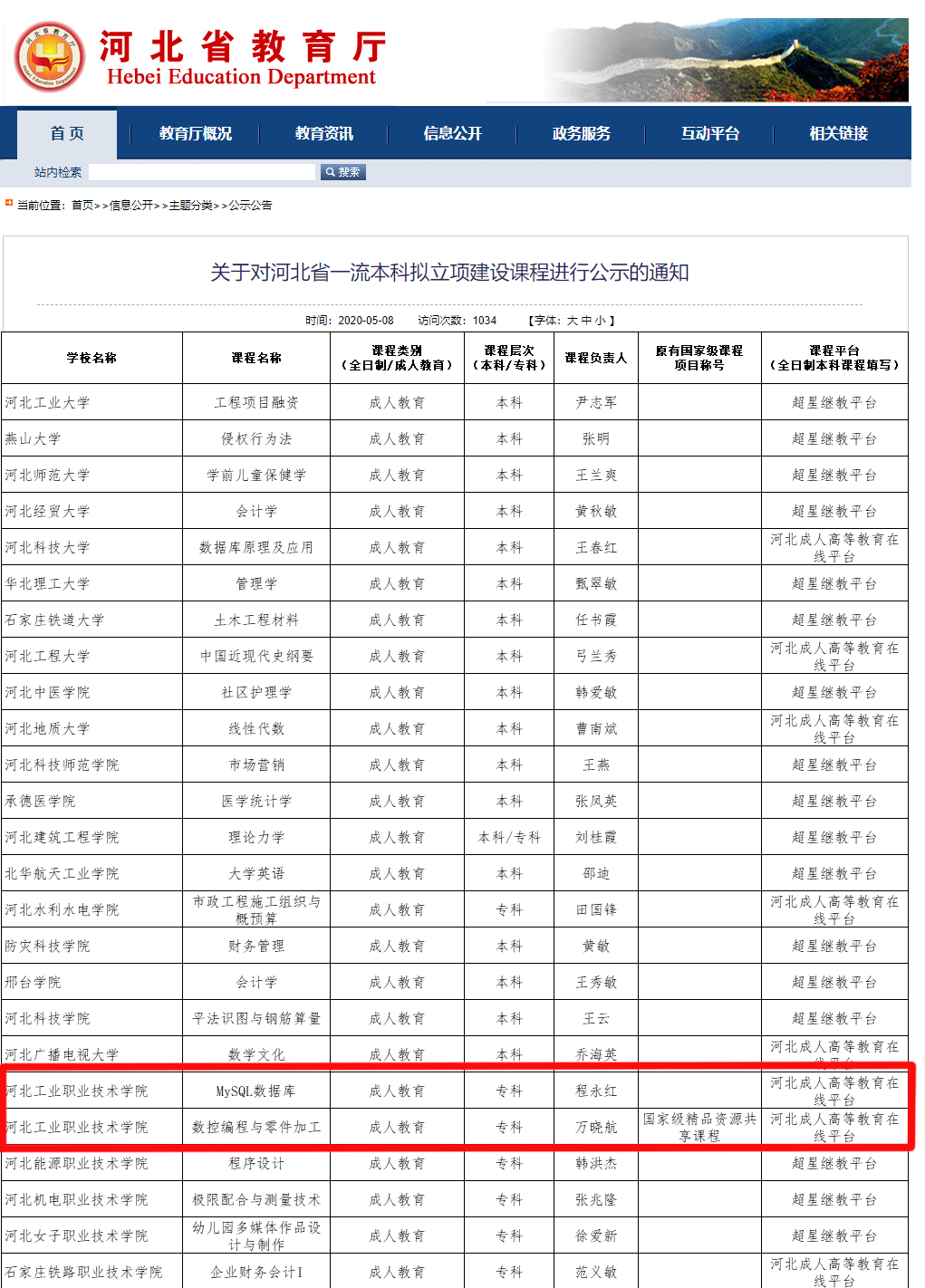 近日,河北省教育厅公布了《2020年河北省高校高等学历继续教育精品在线开放课程立项建设名单的公示》,我院工业基础部万晓航教授主讲课程《数控编程与零件加工》和计算机技术系程永红副教授主讲课程《MySQL数据库》成功入选。此次河北省共有19所本科院校的19门课程入选,5所高职院校的6门课程入选,我院是唯一一所同时入选2门课程的院校。
