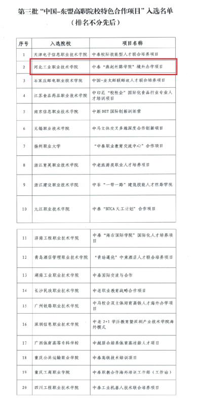 日前,中国教育国际交流协会秘书处(教育部直属单位)公布了第三批“中国-东盟高职院校特色合作项目”,米兰在线(中国)唯一官方网站申报的“中泰‘燕赵丝路学院’境外办学项目”成功入选。