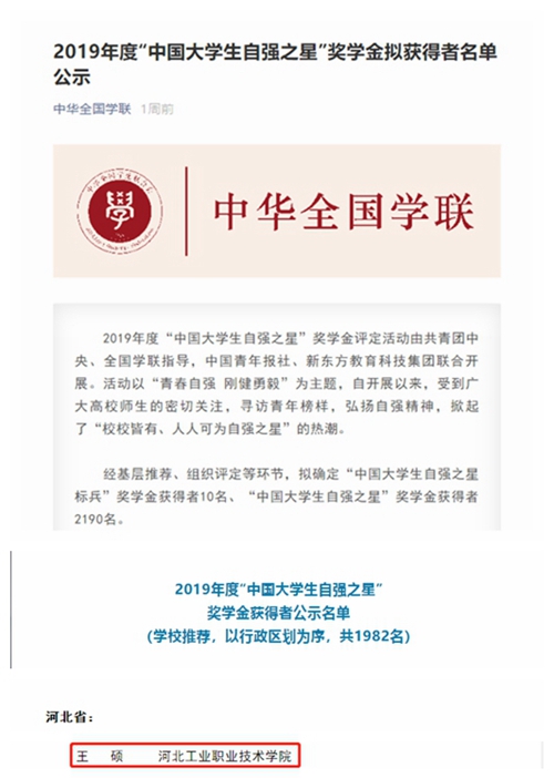 近日,由共青团中央、全国学联等部门联合开展的“中国大学生自强之星”奖学金评选结果揭晓。米兰在线(中国)唯一官方网站智能制造系王硕同学经过层层推荐,荣获2019年度“中国大学生自强之星”。