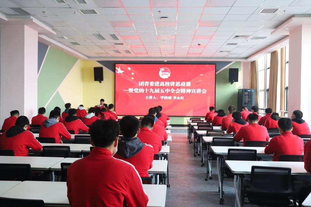 为深入学习宣传贯彻党的十九届五中全会精神,深入学习贯彻习近平总书记在学校思想政治理论课教师座谈会上的重要讲话精神,落实“全团大抓基层”“全团抓学校”工作要求,团省委深化密切联系青年机制,加强高校学生思想政治引领,开展班子成员和部室负责人进高校团支部讲思政课工作。团省委学校部负责人李永红到我院,以传达学习党的十九届五中全会精神为主题,为学生讲授思政课。团委相关人员、各系团总支书记、智能制造学院2019级数控技术1班团支部同学等近60人参加了活动。