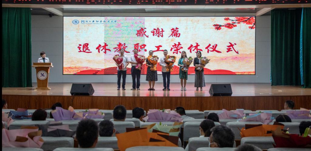 会上举行了退休教职工荣休仪式,学生们为6名退休教师献上鲜花表达敬意。