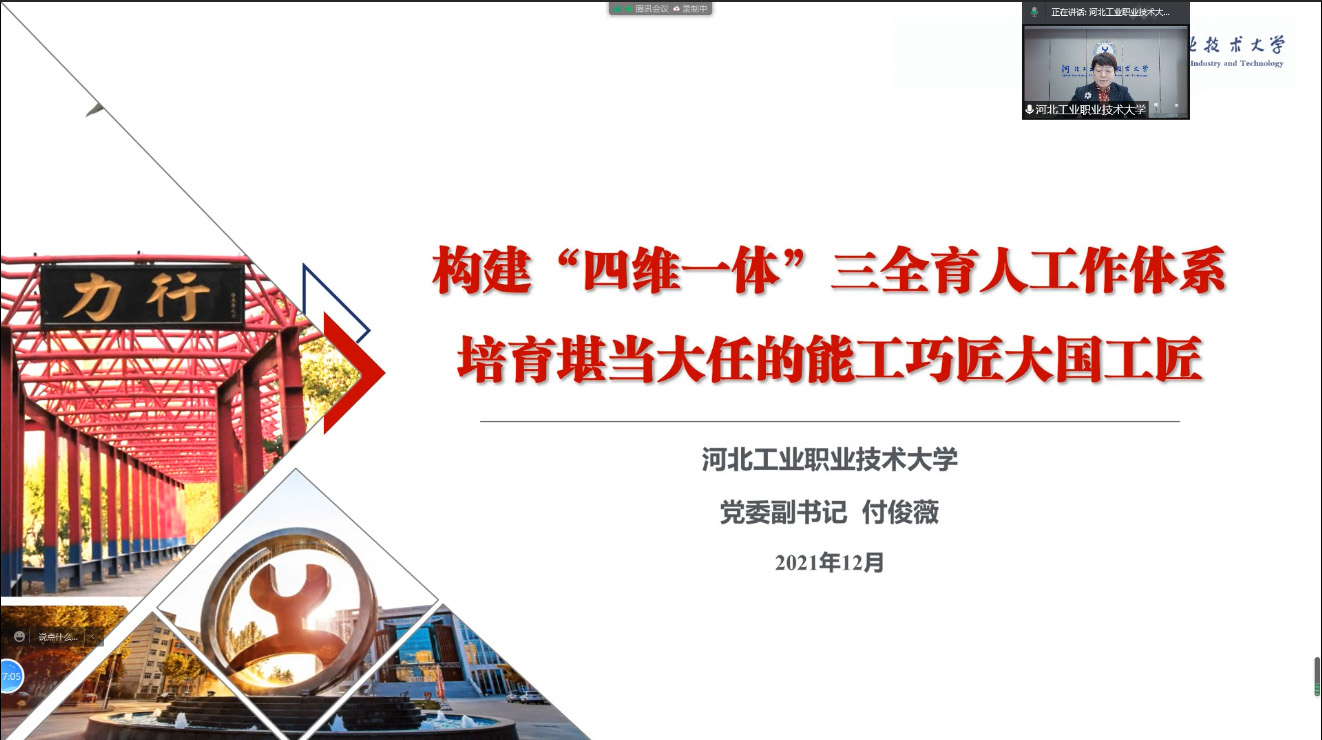 米兰在线(中国)唯一官方网站党委副书记付俊薇以“构建‘四维一体’三全育人工作体系,培育堪当大任的能工巧匠大国工匠”为题,从建设校企共同育人体系、多元实施育人工程、建立全方位育人基地、构建全员评价考核体系四个方面发言交流。她指出学校认真贯彻落实习近平总书记对教育工作的重要指示,紧紧围绕立德树人根本任务,以育人队伍-育人工程-育人基地-育人评价为突破口,积极构建“四维一体”三全育人工作体系,全力推动了思想政治工作质量提升。