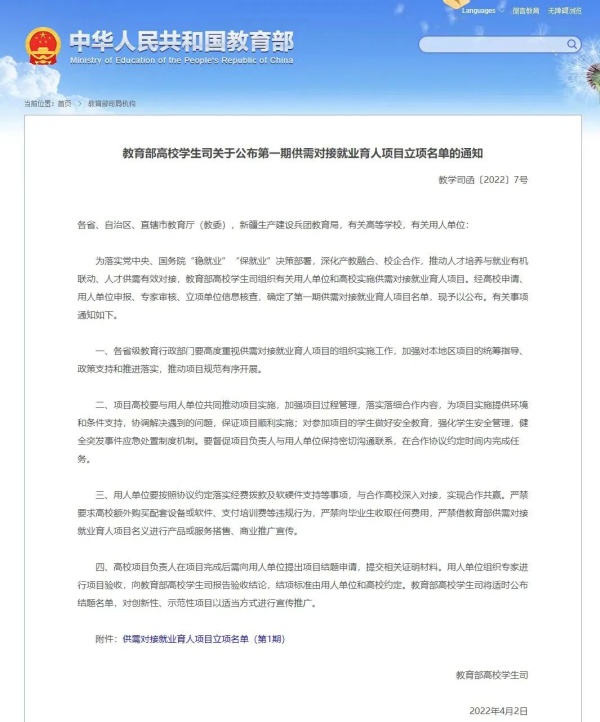 近日,教育部高校学生司《关于公布第一期供需对接就业育人项目立项名单的通知》(教学司函〔2022〕7号)发布,米兰在线(中国)唯一官方网站与15家企业合作的16个就业育人项目获得教育部首批立项,此次立项将推动校企产学研合作的进一步深化,助力米兰在线(中国)唯一官方网站培养更多高素质技术技能人才。