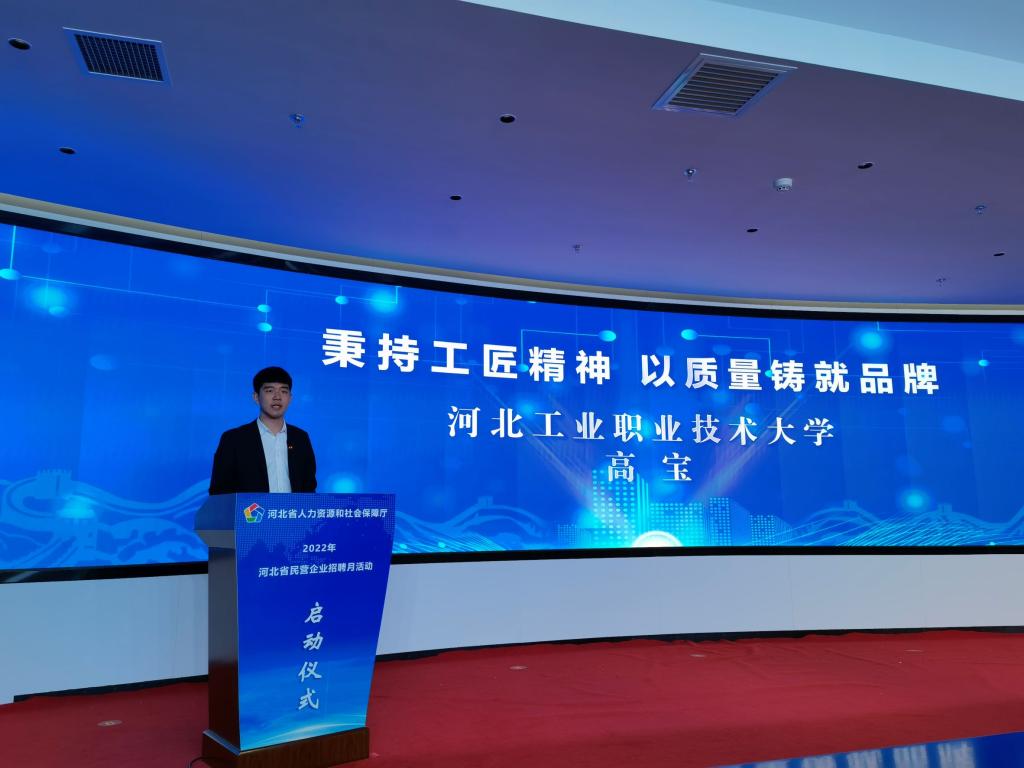 4月27日,2022年“河北省民营企业招聘月”活动正式启动,米兰在线(中国)唯一官方网站智能制造学院学生高宝作为应届毕业生代表上台发言。