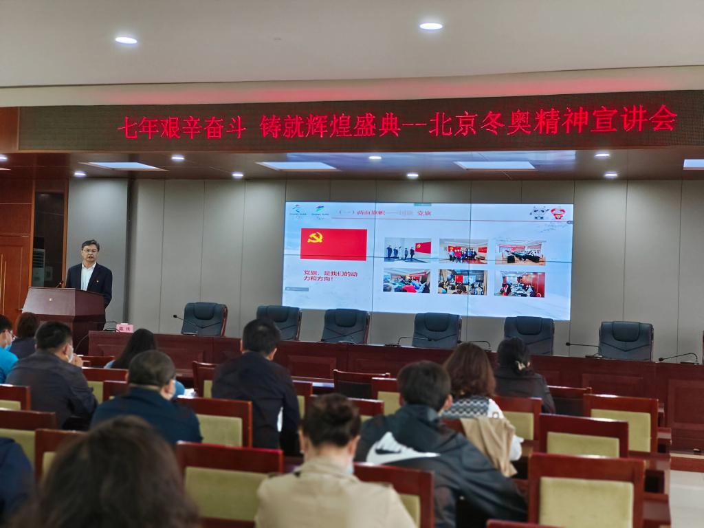 陈伟首先结合自己在北京奥组委志愿服务的工作经历,围绕“两面旗帜”“两件大事”“两种态度”等七个方面,结合冬奥会申办、筹备、赛事的一系列故事向与会人员介绍了冬奥会的整体情况,使大家对“胸怀大局、自信开放、迎难而上、追求卓越、共创未来”的冬奥精神有了更深层次的认识。随后,陈伟向大家展示了奥运小城崇礼的巨大变化,冰雪经济快速发展,人民生活殷实富足,冬奥会给崇礼人民带来了无限希望。最后,陈伟谈到了自己的工作感悟,他切身感受到北京冬奥会、冬残奥会之所以能取得如此辉煌的成绩,党的领导是最根本的保证,也是中国特色社会主义制度巨大优越性的真实体现。