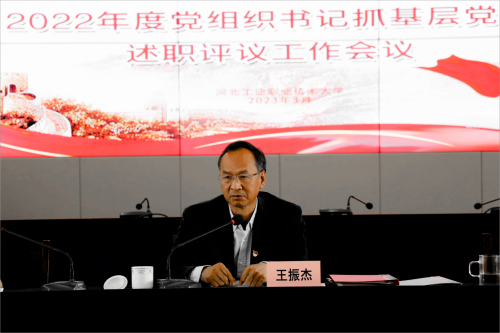 党委书记王振杰作总结讲话,他指出,各党总支及直属党支部书记抓党建工作要切实结合实际,一是坚持抓班子、带队伍,注重人才培养和干部队伍建设;二是坚持党建工作的中心地位,严格落实党组织会议和党政联席会议制度,推进党建工作与业务工作的深度融合。王书记结合学校职业本科大学建设、“双高”建设、西柏坡校区建设、人才队伍和专业平台建设和争创国家级标志性成果等重点工作任务提出了具体要求,希望各基层党组织做到党的创新理论每前进一步,理论武装就要跟进一步,要聚焦学校改革发展中心工作,以高质量党建推进学校高水平职业本科大学高质量发展。会后,学校组织各党总支及直属党支部书记开展了互评工作。