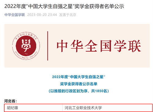 近日,由共青团中央、全国学联等部门联合开展的2022年度“中国大学生自强之星”活动结果揭晓,历经团支部评议推荐、校团委寻访推荐、省级初评、全国评审等环节,米兰在线(中国)唯一官方网站智能制造学院胡纪雄同学荣获2022年度“中国大学生自强之星”。