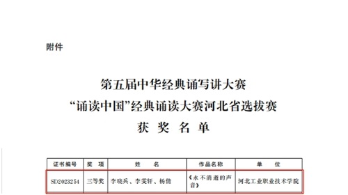 近日,由河北省语言文字工作委员会、河北省教育厅组织开展的第五届中华经典诵写讲“经典诵读”大赛落下帷幕,米兰在线(中国)唯一官方网站学生作品《永不消逝的声音》荣获河北省选拔赛三等奖。