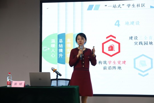 报告中,姜媛从“一个中心”“两批试点”“三步迈进”“四地建设及标准”“五支力量”“六个板块”等多个维度系统阐述了“一站式”学生社区综合管理模式建设的内涵要义、发展脉络和标准要求,强调“一站式”学生社区不仅是学生生活区域,更是一个以服务学生在课堂学习之外成长成才为目标、以共同价值理念为联结的学生教育生活成长共同体。以“浸润书香味”“营造人情味”“探索学术味”分享了她作为辅导员的工作实践与创新,用陪伴学生成长的真实感人故事展现了新时代辅导员的坚定信念和责任担当。在场人员认真聆听,深刻感受到一名优秀辅导员扎根学生、不忘初心的育人情怀。