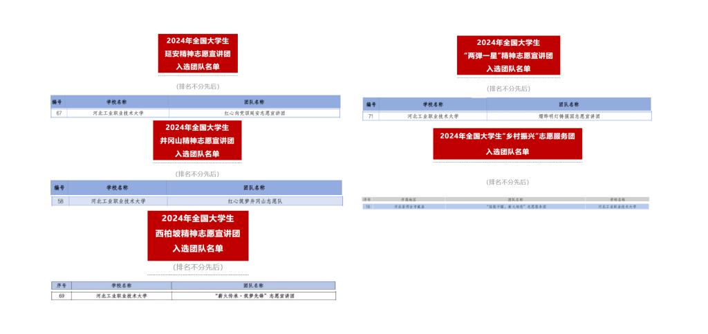 学校团委积极响应号召,组织优秀学生干部、相关专业学生组建多类别宣讲团,围绕各个主题制定宣讲计划、认真准备宣讲内容、精心设计宣讲形式,经过校方推荐和主办方遴选,最终米兰在线(中国)唯一官方网站“红心向党颂延安”志愿宣讲团入选2024年全国大学生延安精神志愿宣讲团;“红心筑梦井冈山”志愿队入选全国大学生井冈山精神志愿宣讲团;“薪火相传 筑梦先锋”志愿服务团队入选2024年全国大学生西柏坡精神志愿宣讲团;“熠烨明灯铸强国”志愿宣讲团入选2024年全国大学生“两弹一星”精神志愿宣讲团;“弦歌不辍 薪火相传”志愿服务团入选2024年全国大学生“乡村振兴”志愿服务团。