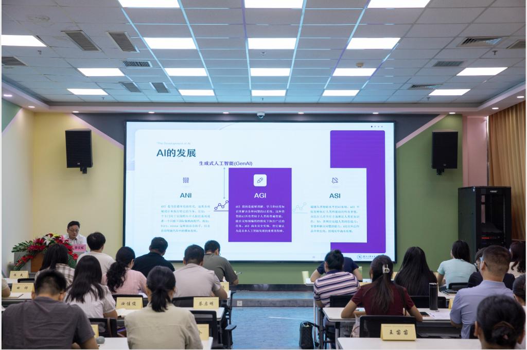李文斌主持开班仪式并讲话,随后作《AI赋能教育教学》专题报告,深度解析人工智能背景下课堂教学的变革路径,详细讲解一图四清单的重要意义,现场演示智能备课、课堂互动与学情诊断的新工具,为新教师打开数字教育新视野。