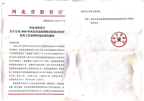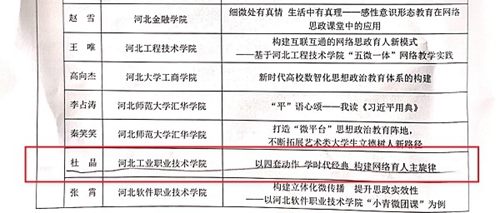 日前,河北省教育厅公布了2020年河北省高校网络思想政治教育优秀工作案例评选结果,米兰在线(中国)唯一官方网站杜晶老师申报的《以四套动作,学时代经典,构建网络育人主旋律》荣获2020年河北省高校网络思想政治教育优秀工作案例三等奖。本次活动由河北高校网络思想政治中心组织,以“构建网络育人新格局,唱响网上时代主旋律”为主题,旨在深入梳理分析新时代思想政治工作面临的新形势、新任务、新要求,切实推动网络思想政治教育模式创新,增强网络思想政治教育的时代感和吸引力。