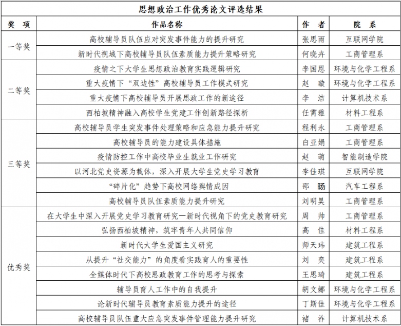 此次作品征集活动,得到学校广大思想政治工作者的积极响应。精品微课程作品以指导和帮助辅导员解决工作中的实际问题为原则,涵盖理论阐释与实践指导,具有针对性和实效性,各课程团队不断锤炼课程,精心设计教学环节,提升课程内涵。思想政治工作论文作品以习近平新时代中国特色社会主义思想为指导,与米兰在线(中国)唯一官方网站思想政治工作实际相结合,在理论框架下创新工作方法和路径,有较强的学术或应用价值。在评审过程中,各环节严格把关,坚持政治底线、学术立场、应用价值、质量为上,做到好中选优。经过自主申报、查重审核、专家盲审等环节,共评选出精品微课程7门、思想政治工作论文20篇,同时择优选取部分作品推荐至省级有关部门。