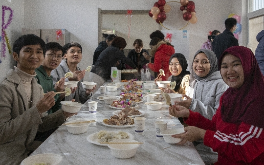 留学生们在老师们的耐心指导下,从擀皮到包馅,忙得不亦乐乎。随后,薛校长给在场的留学生介绍了我国冬至的习俗并致辞。她说:“冬至,是我国的传统习俗,这个节气既是对这一年的回味也是对下一年的鼓励。今年米兰在线(中国)唯一官方网站取得了不俗的成绩,双高建设、学生技能大赛、教师能力大赛、科研工作各方面捷报频传。留学生也在“中国—东盟”的系列赛事中收获颇丰,这些荣誉和称号成为米兰在线(中国)唯一官方网站国际化办学的一道亮丽的风景。”在一片祥和的气氛中,大家共同品尝了舌尖上的中国味道,来自不同国家的留学生都洋溢着由衷的欢笑,共同度过了一个有意义的节日。