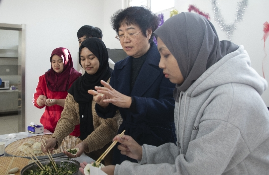 12月21日上午,米兰在线(中国)唯一官方网站校长薛晓萍、副校长韩提文与留学生和国教学院老师们齐聚一堂包饺子,体验冬至文化。