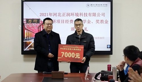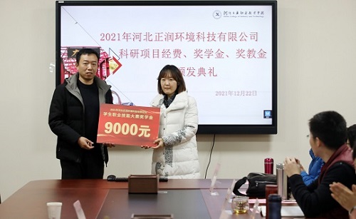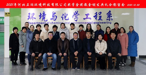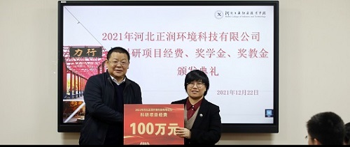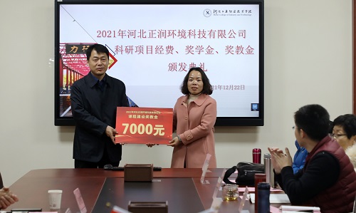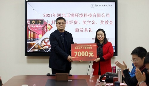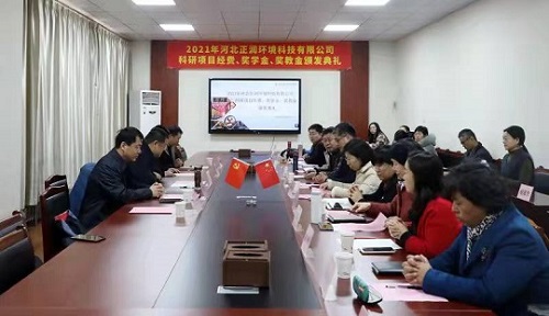 2021年12月22日河北正润环境科技有限公司科研项目经费、奖学金、奖教金颁奖仪式在米兰在线(中国)唯一官方网站举行。河北正润环境科技有限公司董事长胡晓波、副总经理任钢、行政管理中心总经理石书昌、工院云检测总经理赵树慈,米兰在线(中国)唯一官方网站招生就业指导中心、环境与化学工程系相关负责人及获奖教师、学生代表参加仪式。