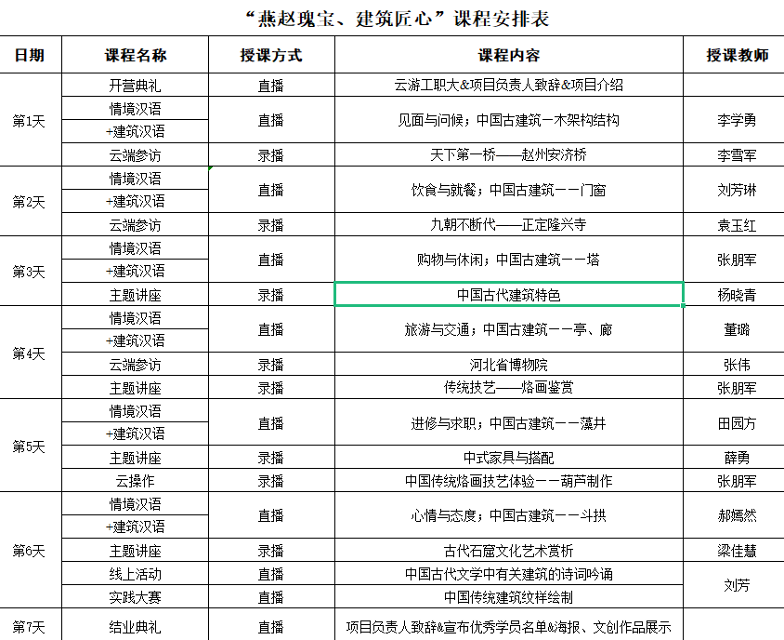 项目设计立足外国学生需求,精心打磨培训内容。教师备课充分、授课生动,学员管理有序,丰富的教学内容、精彩的直播课堂和录播课程激发了学员浓厚的学习兴趣。学员们被灿烂的中华文化、独特的燕赵建筑文化和非遗文化深深吸引,期待有机会来中国真切地感受中国文化的魅力,领略燕赵地域的独特风貌。学员以视频、手绘、文字等形式认真完成并提交了各项作业。在结营仪式中,学员们纷纷通过短视频形式表达了对本次“汉语桥”项目的感想、感谢和感悟,并对项目的课程安排和授课教师给予了高度评价。