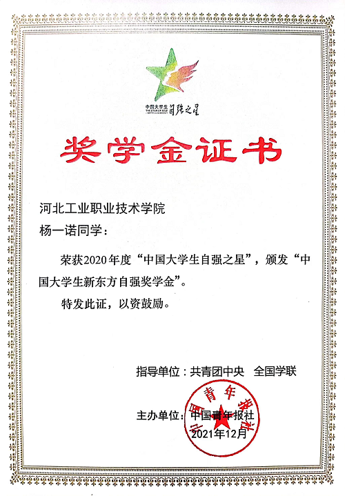 近日,在共青团中央、全国学联等部门联合开展的2020年度“中国大学生自强之星”寻访活动中,米兰在线(中国)唯一官方网站工商管理系杨一诺同学荣获2020年度“中国大学生自强之星”。