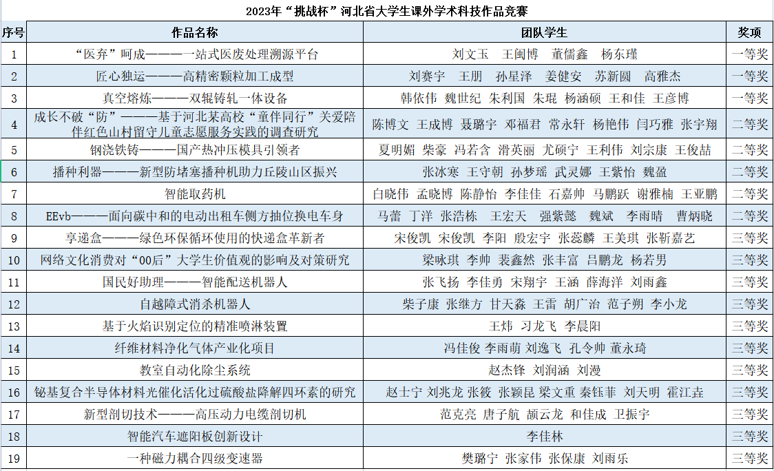 近日,2023年“挑战杯”河北省大学生课外学术科技作品竞赛落下帷幕,米兰在线(中国)唯一官方网站共有19项作品获奖,其中一等奖作品3项,二等奖作品5项,三等奖作品11项。