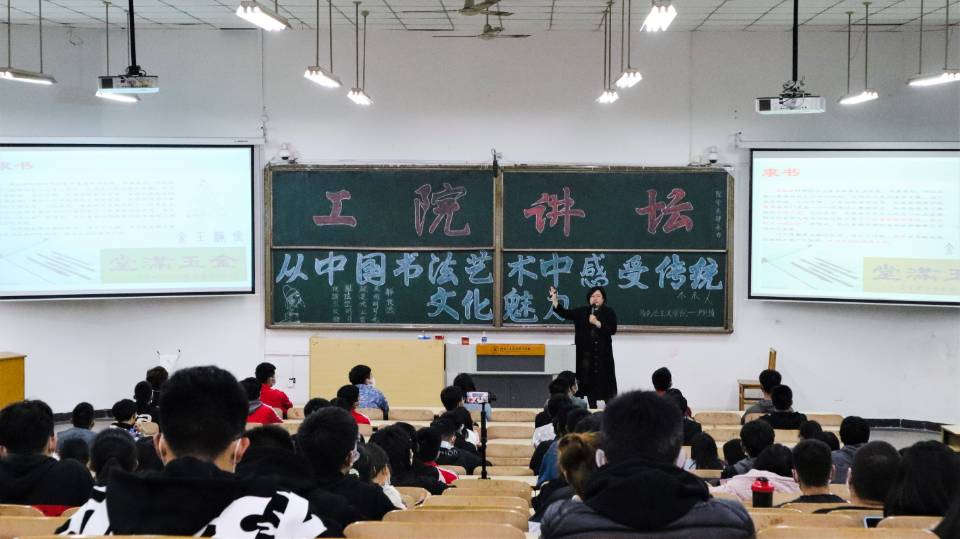 讲座中,尹老师首先以甲骨文为开端,带领我们追溯到几千年前。早在三皇五帝时期,人类就发明了甲骨文,这是迄今为止发现的最早的文字。接着,又讲述了字体的演变历程,从甲骨文到金文(大篆)、小篆、隶书、草书、楷书、行书等不同字体的起源、演进、发展和阶段特征,这为我国书法艺术的形成拉开了序幕。随着历史更迭,书法名人辈出,他们对书法艺术都有着独特的见解。宋徽宗创造了瘦金体;出身于书香门第却身世坎坷的郑板桥以画法书写了自己的精神追求;一代伟人毛泽东,豪气冲天、纵横驰骋的字体备受瞩目。改革开放后,全国掀起了“书法热”的浪潮,其中以启功先生最具代表性,形成了启功体书法。我国的汉字从商代发展到今天,已经走过了悠悠三千余年,形成了篆,隶,草,楷,行,五大字体,历朝历代的中国人把对美的追求注入到这五大字体之中,使得这五大字体有了生命和灵魂。最后,尹老师以“端端正正写字,堂堂正正做人”为结尾,使同学们领悟到书法艺术不但是一种美,更是一种可以见证人心性情的修为。