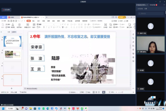 11月28日晚,马克思主义学院的宋蕾老师通过学习通线上授课方式以“陆游的爱国情怀与儿女情长”为主题展开精彩讲座,向同学们介绍陆游坎坷的一生。